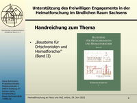 Die Online-Veranstaltung „Heimatforschung an Haus und Hof“ konnte am Sonnabend, dem 19. Juni erfolgreich durch Klaus Reichmann und dem Heimatforschungsprojekt des SLK durchgeführt werden. Vier Referentinnen und Referenten unterstützten Heimatforschende mit ihren Beiträgen rund um das Thema Haus und Hof. Als Ersatz zum eigentlich geplanten 5. Fachtag für Ortschronisten und Heimatforschende folgten der Online-Veranstaltung über 20 Teilnehmende aus ganz Sachsen. Dr. Hans-Jürgen Ketzer, ehem. Leiter des Volkskundemuseums Wyhra, veranschaulichte das Thema der Online-Tagung mit seinem Impulsreferat „Auf der Spur der Steine – Haus- und Hofgeschichte(n) aufgedeckt“. Die Referentin Dr. Meike Leyde vom Hennebergischen Museum Kloster Veßra verdeutlichte den Teilnehmenden den Umgang mit Dachbodenfunden und zeigte, wie solche ins Museum gelangen können. Christian Meyer vom Landesverein Sächsischer Heimatschutz e. V. referierte über die Baustilkunde auf dem Lande und dessen Entwicklung. Den Teilnehmenden bot er mit seinem Vortrag eine zusammenfassende Literaturüberschau zu diesem Thema, die er inhaltlich zur Weiternutzung erläuterte. Einen Ein- und Ausblick über das Forschungsprojekt „Polyphonie der Heimat“ gab Dr. Johannes Schütz von der TU Dresden. In diesem wird er den Heimatbegriff seit der Mitte der DDR-Zeit bis zur Gegenwart mithilfe von Zeitzeugen betrachten. Die Veranstaltung wurde evaluiert und alle Teilnehmenden gaben ein durchweg positives Feedback zu dieser Online-Tagung. Wir bedanken uns bei allen Teilnehmenden, den ReferentInnen und den fleißigen Helferinnen im Hintergrund.