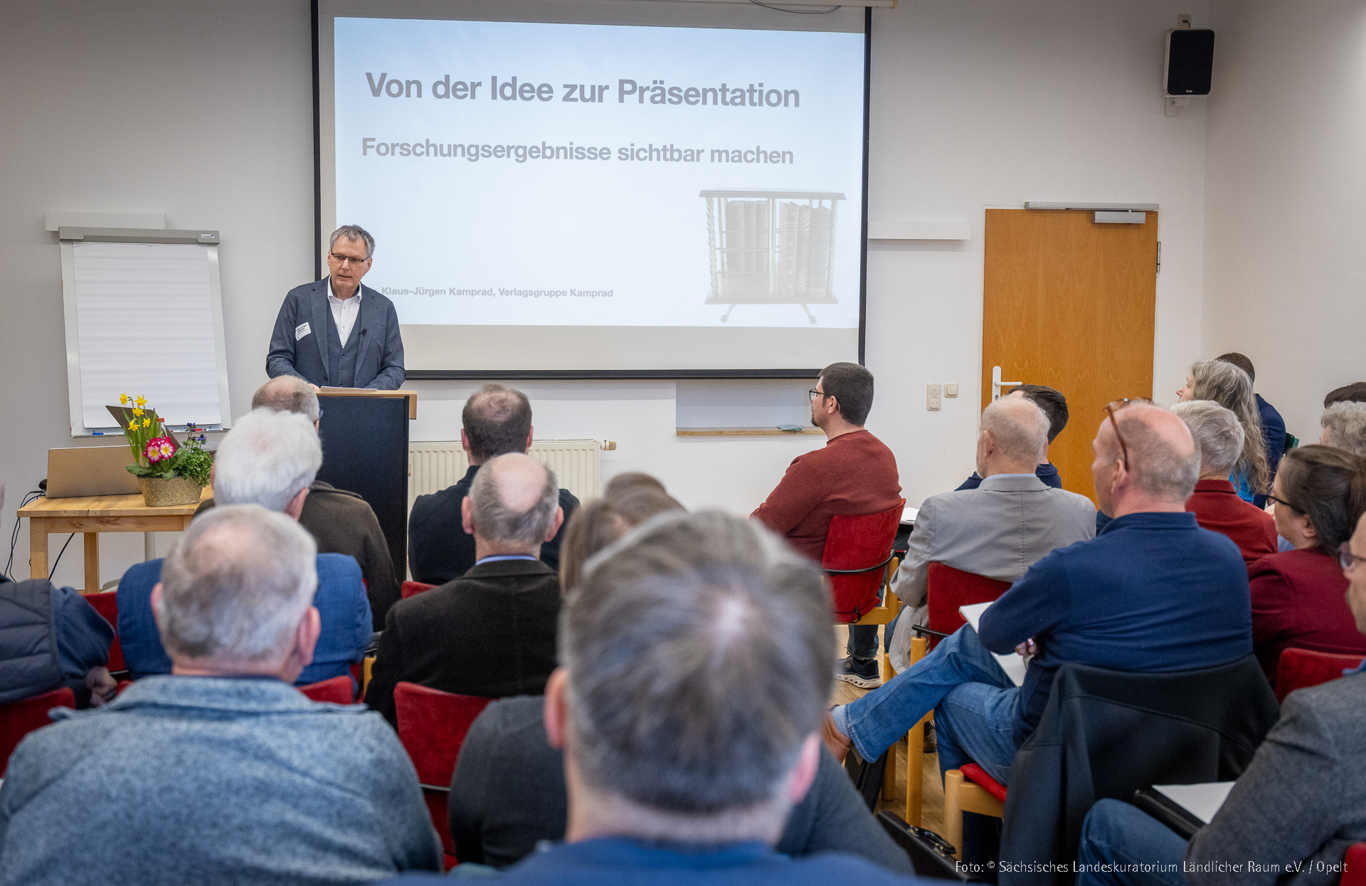 Nach der Begrüßung durch Dr. Dirk Martin Mütze eröffnete der Verleger Dr. Klaus-Jürgen Kamprad den Fachtag mit einem Impuls, der den Kern der Veranstaltung auf den Punkt brachte: Heimatgeschichte entsteht nicht allein durch das Sammeln von Fakten, sondern durch die Art und Weise, wie sie erzählt wird. Entscheidend ist die Frage nach dem Zugang – also danach, für wen Geschichte aufbereitet wird, welche Form sie annimmt und welche zentrale Botschaft transportiert werden soll. Anhand konkreter Beispiele zeigte er, wie sich aus historischen Quellen unterschiedliche Erzählstränge entwickeln lassen und wie aus Forschung eine Geschichte wird, die Menschen erreicht.